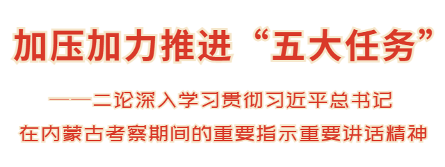 “五大任务”是习近平总书记从国家发展全局出发赋予内蒙古的战略定位。习近平总书记此次在内蒙古考察,对近年来我区各项事业发展特别是办好落实“五大任务”和全方位建设“模范自治区”两件大事给予肯定,为我们紧扣战略定位做好各项工作进一步指明了方向和路径。深入学习贯彻习近平总书记在内蒙古考察期间的重要指示重要讲话精神,必须牢牢把握这一战略定位,加压加力推进“五大任务”,确保“两个屏障”“两个基地”“一个桥头堡”建设尽快取得成果。