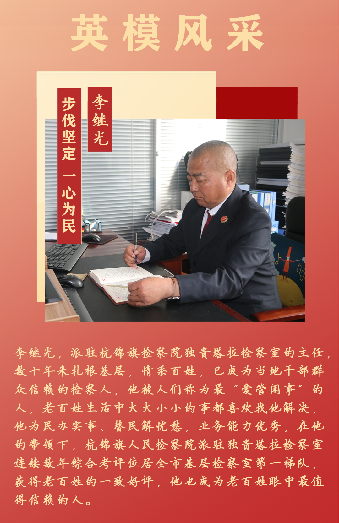 2020年3月,郝大爷将早已准备好的锦旗和感谢信送到了独贵检察室,感谢有这样坚持以证据说话,为民服务的检察官。李继光对能帮助郝大爷解决困难感到欣慰。其实李继光的故事还有很多,他最早便是在独贵塔拉参加的工作,后来到检察院又被派驻到独贵检察室作为基层检察官服务,独贵塔拉可以说是他的第二故乡,他熟悉这里的一草一木、风土人情,他用自己的力量带动12名当地企业家资助12户贫困家庭,为他们购买生产用具牲畜,资助孩子上学完成学业,滴水汇大川,越来越多的企业家表示要加入资助行列。