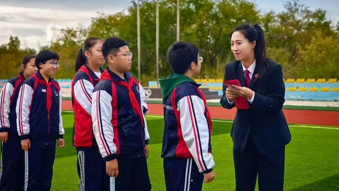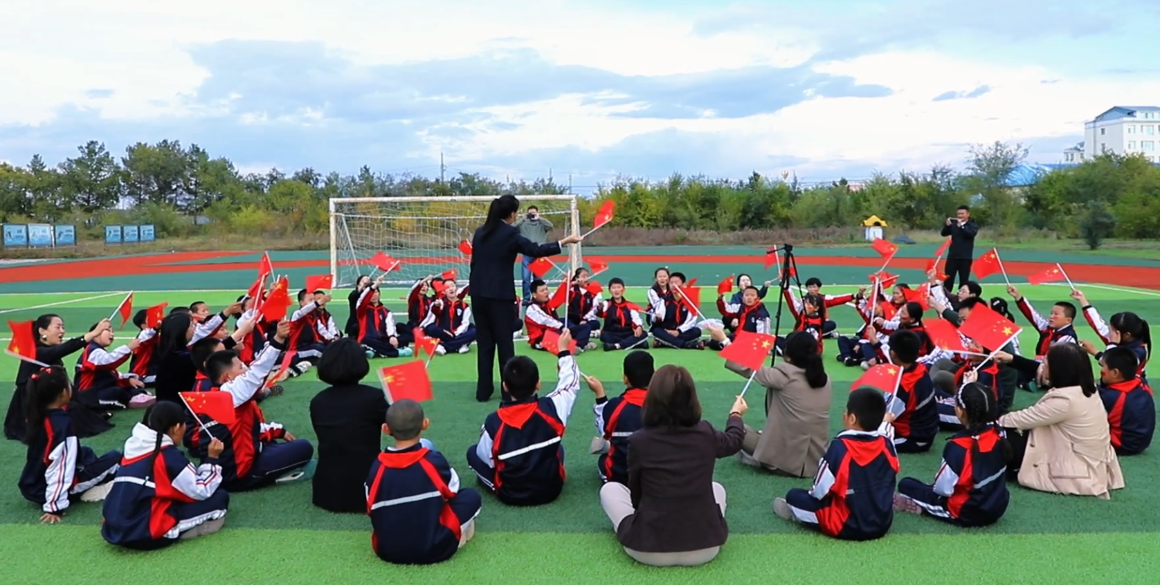 随着歌曲《我爱你中国》的旋律在操场响起,活动被推向最动人的高潮。同学们在操场围坐成温暖的圆圈,稚嫩的脸庞贴上了小红旗贴纸,这抹鲜艳的红衬着纯真的笑容,像一颗颗小小的太阳在阳光下闪闪发光。随着“我爱你中国,亲爱的母亲……”熟悉的旋律响起,大家纷纷举起手里的小红旗齐声合唱,眼里闪着泪光,身体不自觉地跟着节奏摆动,把对祖国的热爱唱给蓝天白云听。红色的旗帜随着歌声的节奏轻轻晃动,像一片涌动的红色浪潮,成为了校园里最动人的风景。