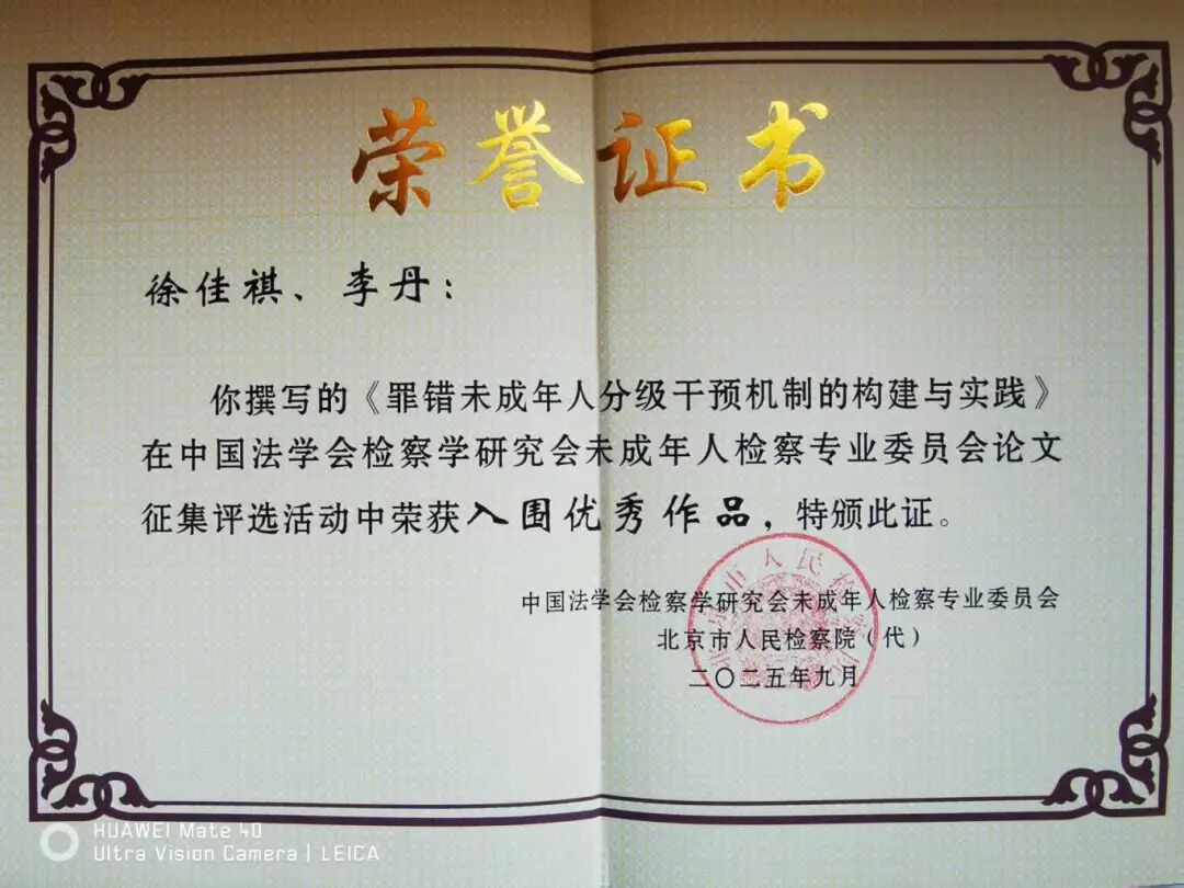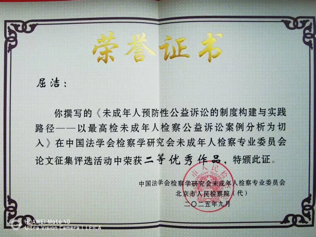 近日,在中国法学会检察学研究会未成年人检察专业委员会2025年年会上,呼和浩特市检察院未成年人检察部主任屈洁撰写的论文《未成年人预防性公益诉讼的制度构建与实践路径—以最高检未成年人检察公益诉讼案例分析为切入》获评“二等优秀作品”。兴安盟检察分院未成年人检察部主任徐佳琪、检察官助理李丹撰写的论文《罪错未成年人分级干预机制的构建与实践》获评“入围优秀作品”。