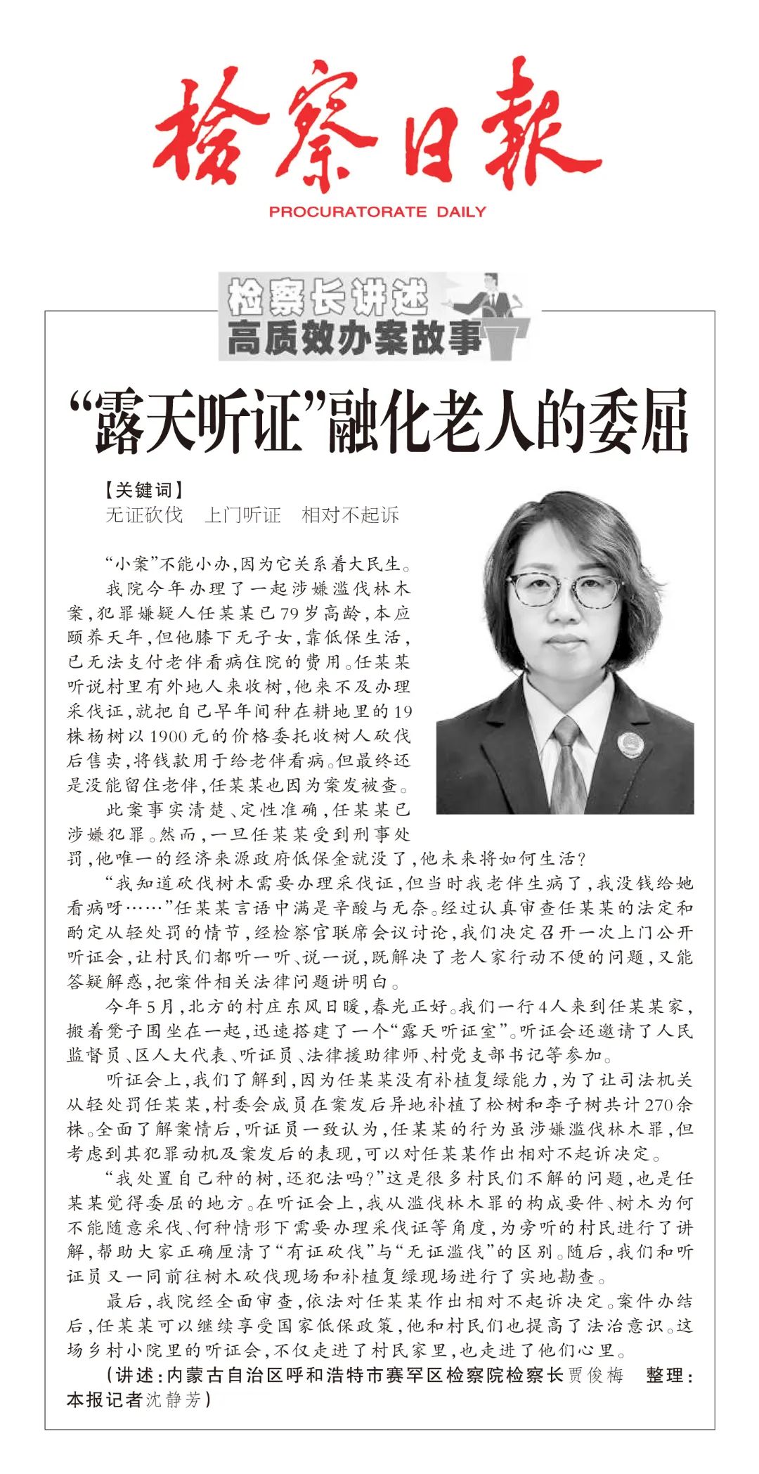 “我知道砍伐树木需要办理采伐证,但当时我老伴生病了,我没钱给她看病呀……”任某某言语中满是辛酸与无奈。经过认真审查任某某的法定和酌定从轻处罚的情节,经检察官联席会议讨论,我们决定召开一次上门公开听证会,让村民们都听一听、说一说,既解决了老人家行动不便的问题,又能答疑解惑,把案件相关法律问题讲明白。
