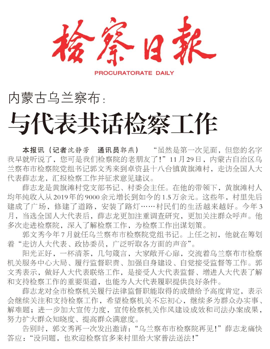 “虽然是第一次见面,但您的名字我早就听说了,您可是我们检察院的老朋友了!”11月29日,内蒙古自治区乌兰察布市检察院党组书记郭文秀来到卓资县十八台镇黄旗滩村,走访全国人大代表薛志龙,汇报检察工作并征求意见建议。