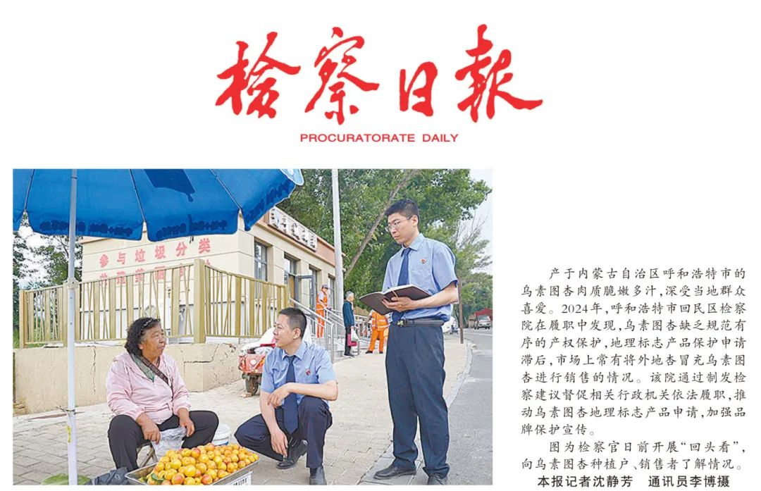 产于内蒙古自治区呼和浩特市的乌素图杏肉质脆嫩多汁,深受当地群众喜爱。2024年,呼和浩特市回民区检察院在履职中发现,乌素图杏缺乏规范有序的产权保护,地理标志产品保护申请滞后,市场上常有将外地杏冒充乌素图杏进行销售的情况。该院通过制发检察建议督促相关行政机关依法履职,推动乌素图杏地理标志产品申请,加强品牌保护宣传。
