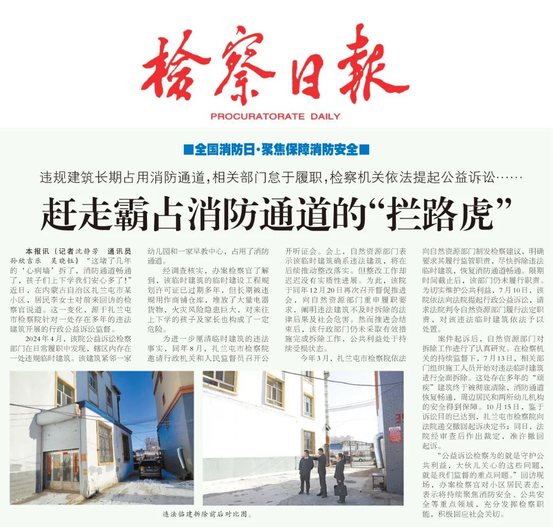 案件起诉后,自然资源部门对拆除工作进行了认真研究。在检察机关的持续监督下,7月13日,相关部门组织施工人员开始对违法临时建筑进行全面拆除。这处存在多年的“顽疾”建筑终于被彻底清除,消防通道恢复畅通,周边居民和两所幼儿机构的安全得到保障。10月15日,鉴于诉讼目的已达到,扎兰屯市检察院向法院递交撤回起诉决定书;同日,法院经审查后作出裁定,准许撤回起诉。