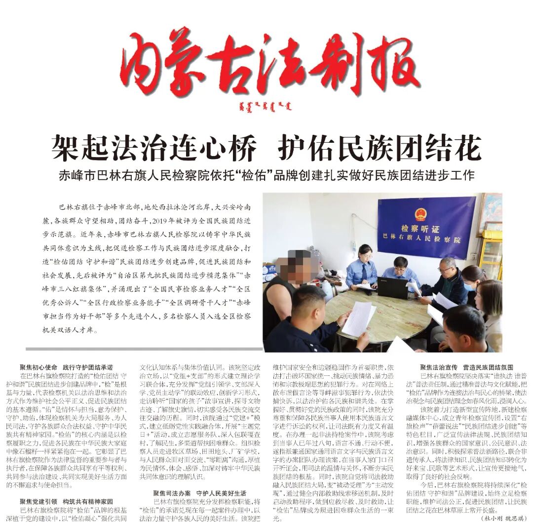 巴林右旗位于赤峰市北部,地处西拉沐沦河北岸,大兴安岭南麓,各族群众守望相助,团结奋斗,2019年被评为全国民族团结进步示范旗。近年来,赤峰市巴林右旗检察院以铸牢中华民族共同体意识为主线,把促进检察工作与民族团结进步深度融合,打造“检佑团结守护和谐”民族团结进步创建品牌,促进民族团结和社会发展,先后被评为“自治区第九批民族团结进步模范集体”“赤峰市三八红旗集体”,并涌现出了“全国民事检察业务人才”“全区优秀公诉人”“全区行政检察业务能手”“全区调研骨干人才”“赤峰市担当作为好干部”等多个先进个人,多名检察人员入选全区检察机关双语人才库。