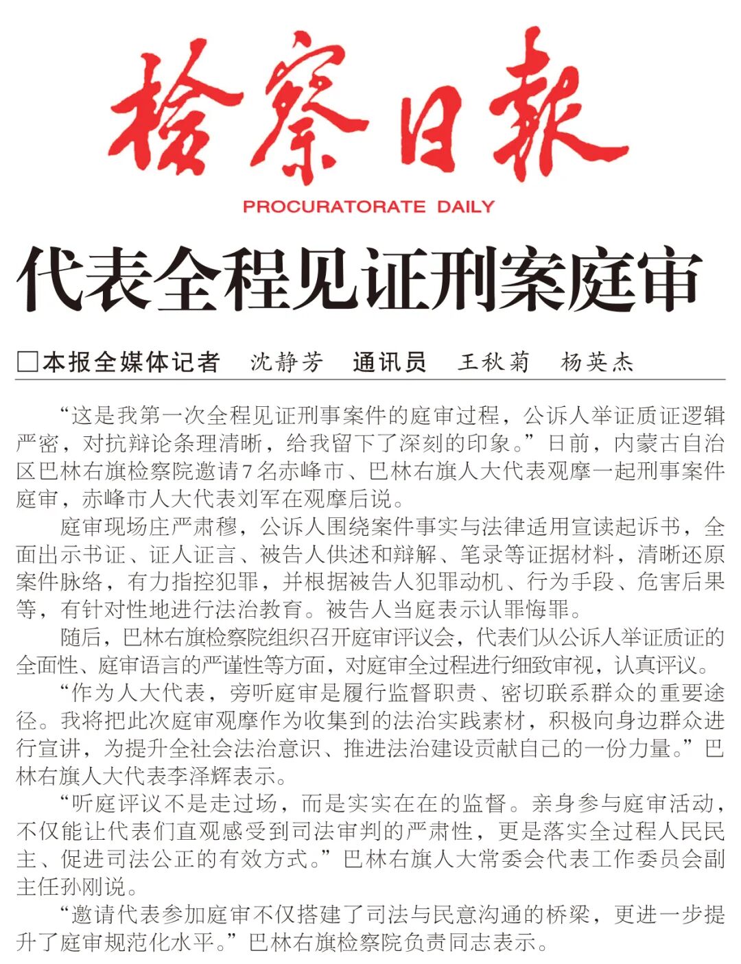 “邀请代表参加庭审不仅搭建了司法与民意沟通的桥梁,更进一步提升了庭审规范化水平。”巴林右旗检察院负责同志表示。