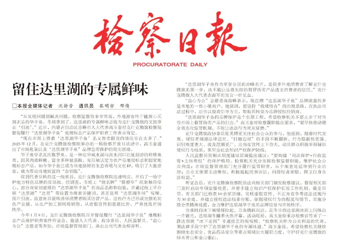 “从发现问题到解决问题,检察监督效率非常高,外地游客终于能放心买到正品的华子鱼。冬捕季到了,达里湖的专属鲜味必能为克什克腾旗的文旅事业‘引流’。”近日,内蒙古自治区赤峰市人大代表高玉奎对克什克腾旗检察院督促履行“达里湖华子鱼”地理标志产品保护职责工作表示肯定。