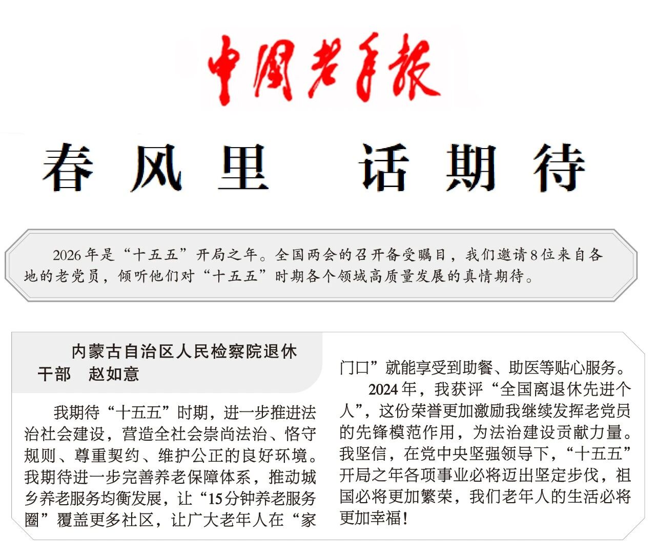 2026年是“十五五”开局之年,全国两会的召开备受瞩目。一起来看全国离退休干部先进个人、内蒙古自治区人民检察院退休干部赵如意对“十五五”时期高质量发展的真情期待~