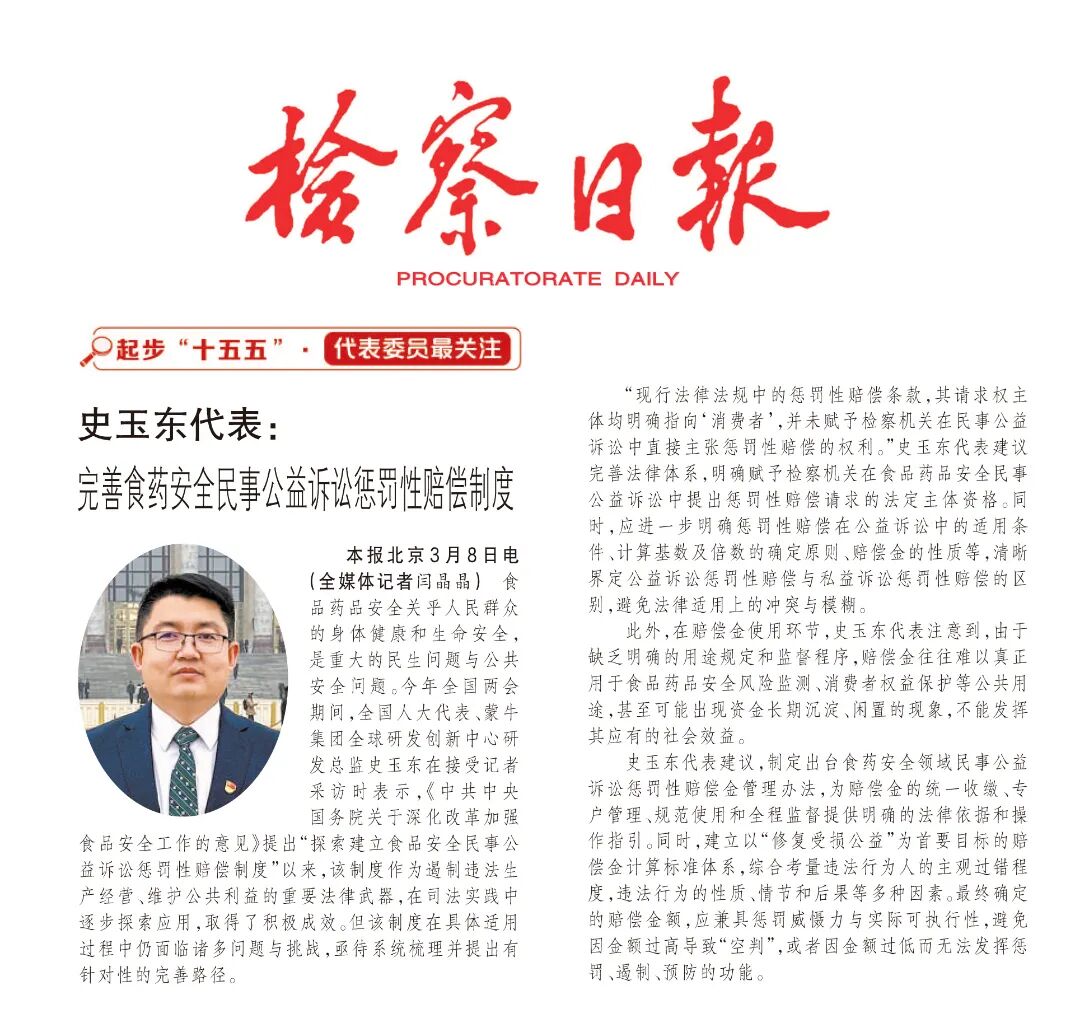“现行法律法规中的惩罚性赔偿条款,其请求权主体均明确指向‘消费者’,并未赋予检察机关在民事公益诉讼中直接主张惩罚性赔偿的权利。”史玉东代表建议完善法律体系,明确赋予检察机关在食品药品安全民事公益诉讼中提出惩罚性赔偿请求的法定主体资格。同时,应进一步明确惩罚性赔偿在公益诉讼中的适用条件、计算基数及倍数的确定原则、赔偿金的性质等,清晰界定公益诉讼惩罚性赔偿与私益诉讼惩罚性赔偿的区别,避免法律适用上的冲突与模糊。