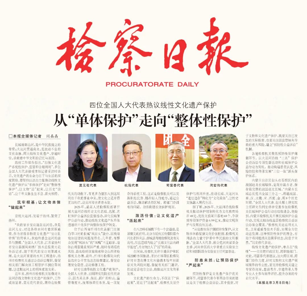 2025年,最高人民检察院部署开展大运河沿线历史文化名城、名镇、名村保护公益诉讼监督活动,深化长城保护公益行动,推动线性文化遗产从单体遗迹碎片化保护向整体性保护转变。