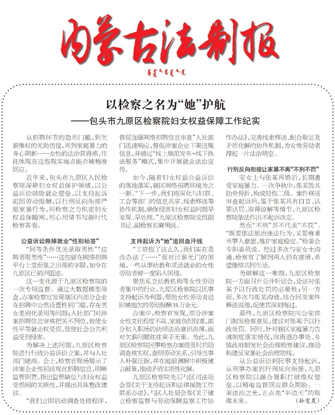 九原区检察院先后与区司法局会签《关于支持起诉和法律援助工作联系办法》,与区人社局会签《关于建立检察监督与劳动保障监察工作协作办法》,完善线索移送、配合取证及矛盾化解的协作机制,为女性劳动者撑起一片法治晴空。
