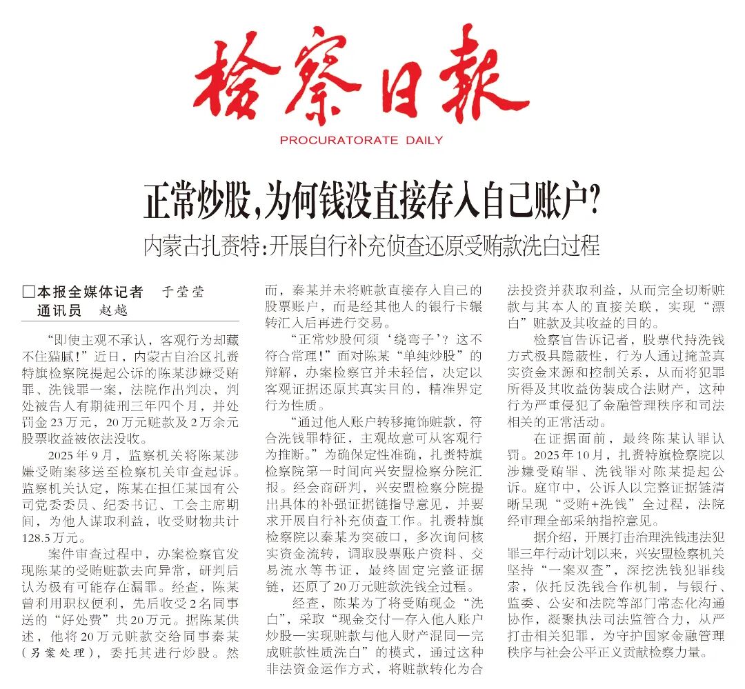 在证据面前,最终陈某认罪认罚。2025年10月,扎赉特旗检察院以涉嫌受贿罪、洗钱罪对陈某提起公诉。庭审中,公诉人以完整证据链清晰呈现“受贿+洗钱”全过程,法院经审理全部采纳指控意见。