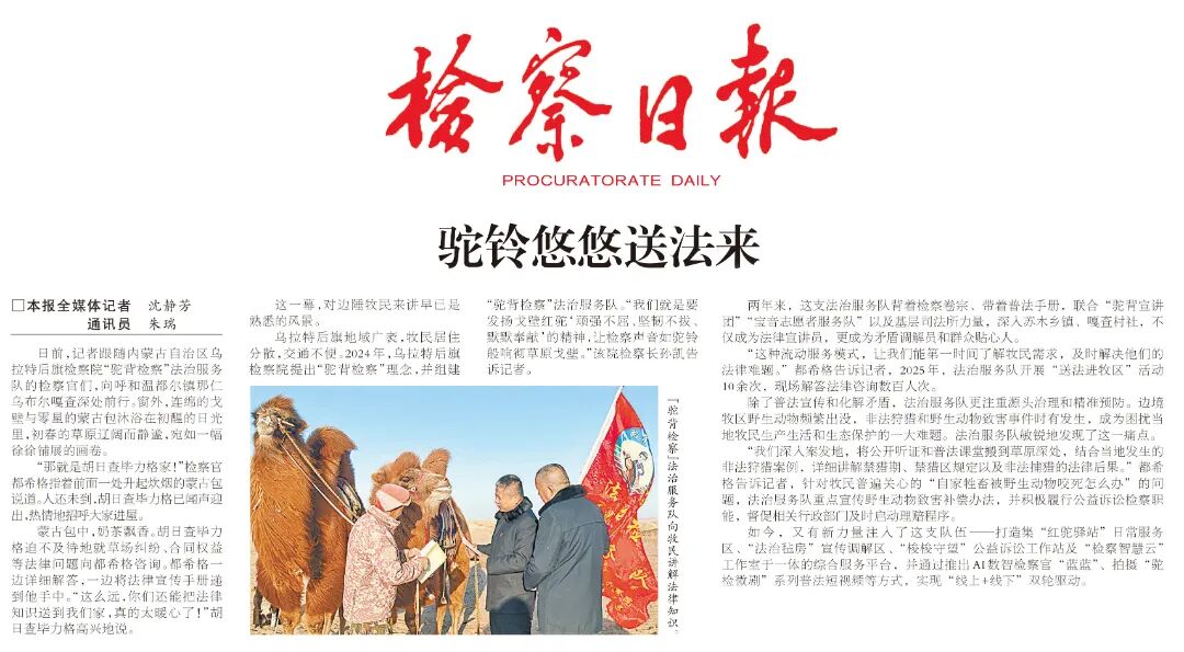 乌拉特后旗地域广袤,牧民居住分散,交通不便。2024年,乌拉特后旗检察院提出“驼背检察”理念,并组建“驼背检察”法治服务队。“我们就是要发扬戈壁红驼‘顽强不屈、坚韧不拔、默默奉献’的精神,让检察声音如驼铃般响彻草原戈壁。”该院检察长孙凯告诉记者。