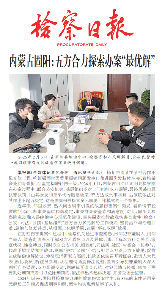近年来,邻里乡亲、熟人间因琐事引发的故意伤害案件频发,看似情节轻微的“小案”,却事关基层和谐稳定,事关群众安全感和满意度。对此,固阳县检察院主动融入县综治中心规范化建设,牵头探索推行故意伤害类案件“检察+公安+司法+乡镇+基层组织”五方合力多元解纷工作模式,坚持治罪与治理并重、惩治与修复并重,从根源上化解矛盾,达到“事心双解”效果。