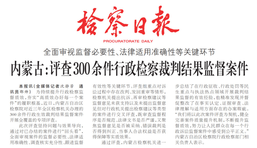 通过评查,内蒙古检察机关进一步总结了在行政征收、行政处罚等民生重点与执法热点领域开展裁判结果监督的有效经验,也精准发现并督促整改了在事实认定、证据审查、法律理解与适用方面存在的办案瑕疵。“我们将以此次案件评查为契机,健全完善案件质量提升机制,不断提升监督质效,努力让人民群众在每一个行政诉讼监督案件中感受到公平正义。”内蒙古自治区检察院行政检察部门相关负责人表示。