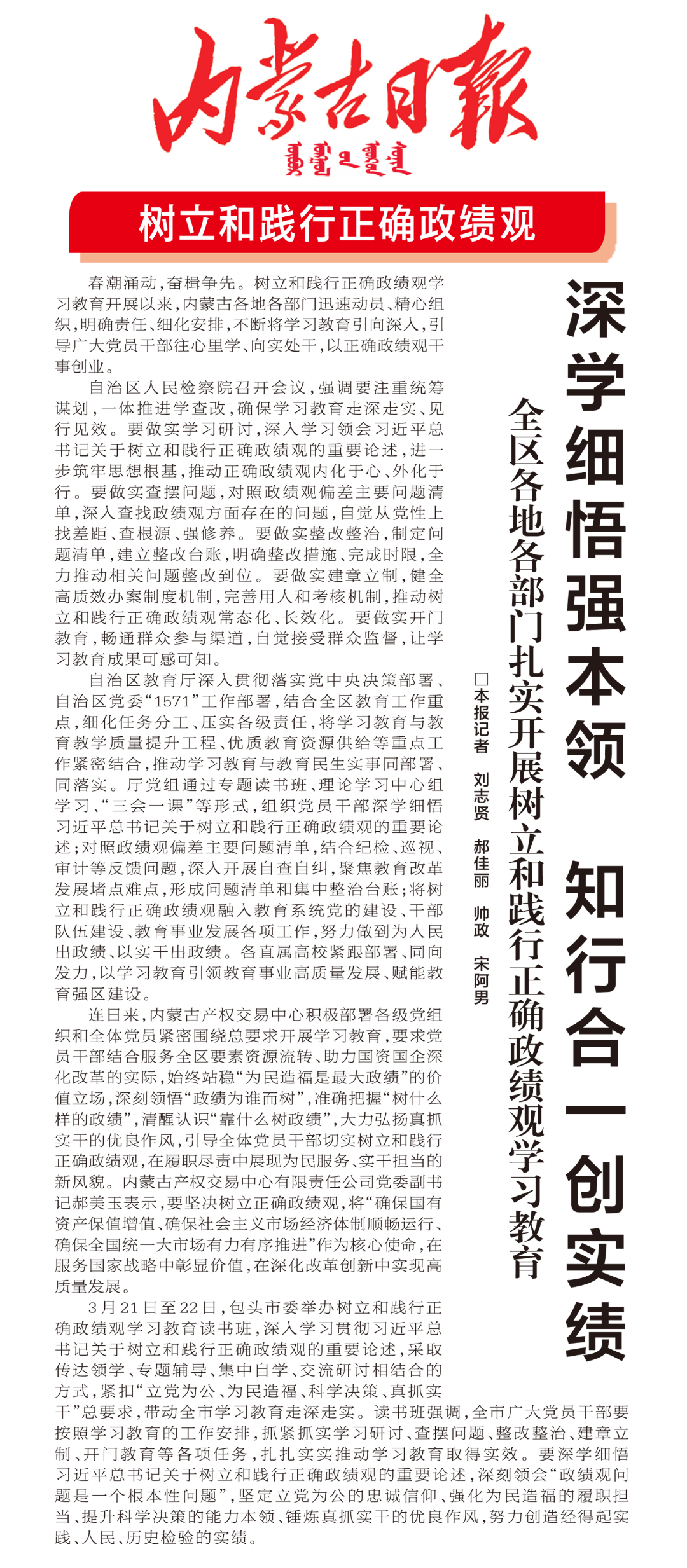 春潮涌动,奋楫争先。树立和践行正确政绩观学习教育开展以来,内蒙古各地各部门迅速动员、精心组织,明确责任、细化安排,不断将学习教育引向深入,引导广大党员干部往心里学、向实处干,以正确政绩观干事创业。