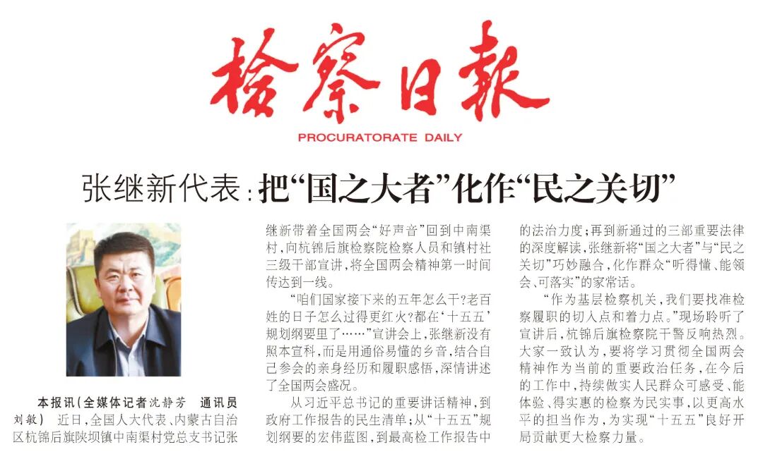近日,全国人大代表、内蒙古自治区杭锦后旗陕坝镇中南渠村党总支书记张继新带着全国两会“好声音”回到中南渠村,向杭锦后旗检察院检察人员和镇村社三级干部宣讲,将全国两会精神第一时间传达到一线。