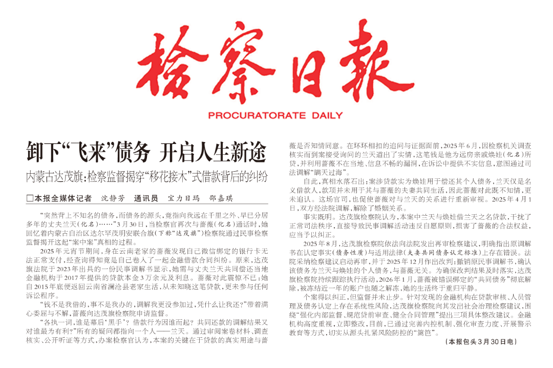 “突然背上不知名的债务,而债务的源头,竟指向我远在千里之外、早已分居多年的丈夫兰天(化名)……”3月30日,当检察官再次与蔷薇(化名)通话时,她回忆着内蒙古自治区达尔罕茂明安联合旗(下称“达茂旗”)检察院通过民事检察监督揭开这起“案中案”真相的过程。