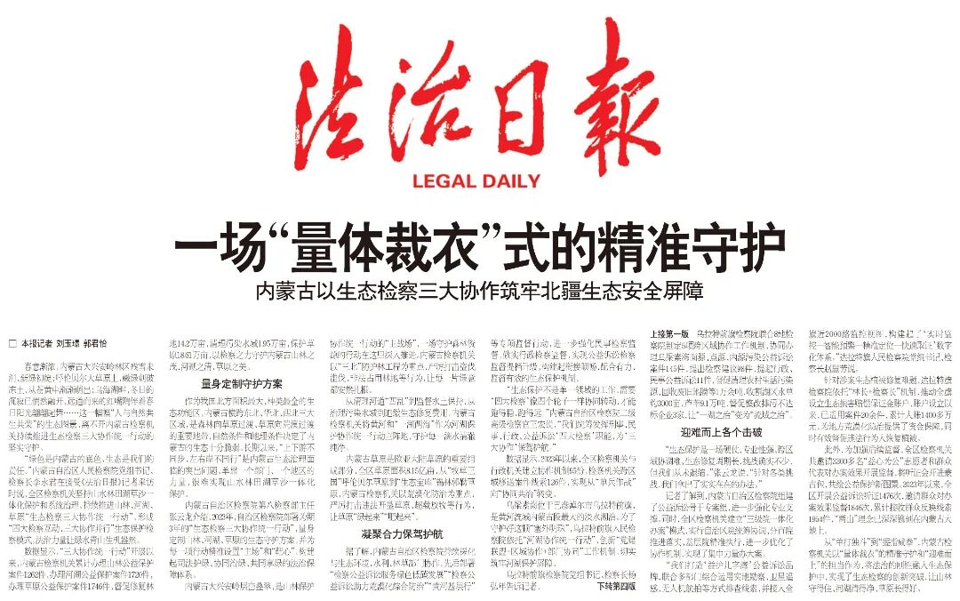 内蒙古自治区检察院第八检察部主任张云龙介绍,2023年,自治区检察院部署为期3年的“生态检察三大协作统一行动”,量身定制山林、河湖、草原的生态守护方案,并为每一项行动精准设置“主场”和“靶心”,构建起司法护绿、协同治绿、共同享绿的法治保障体系。