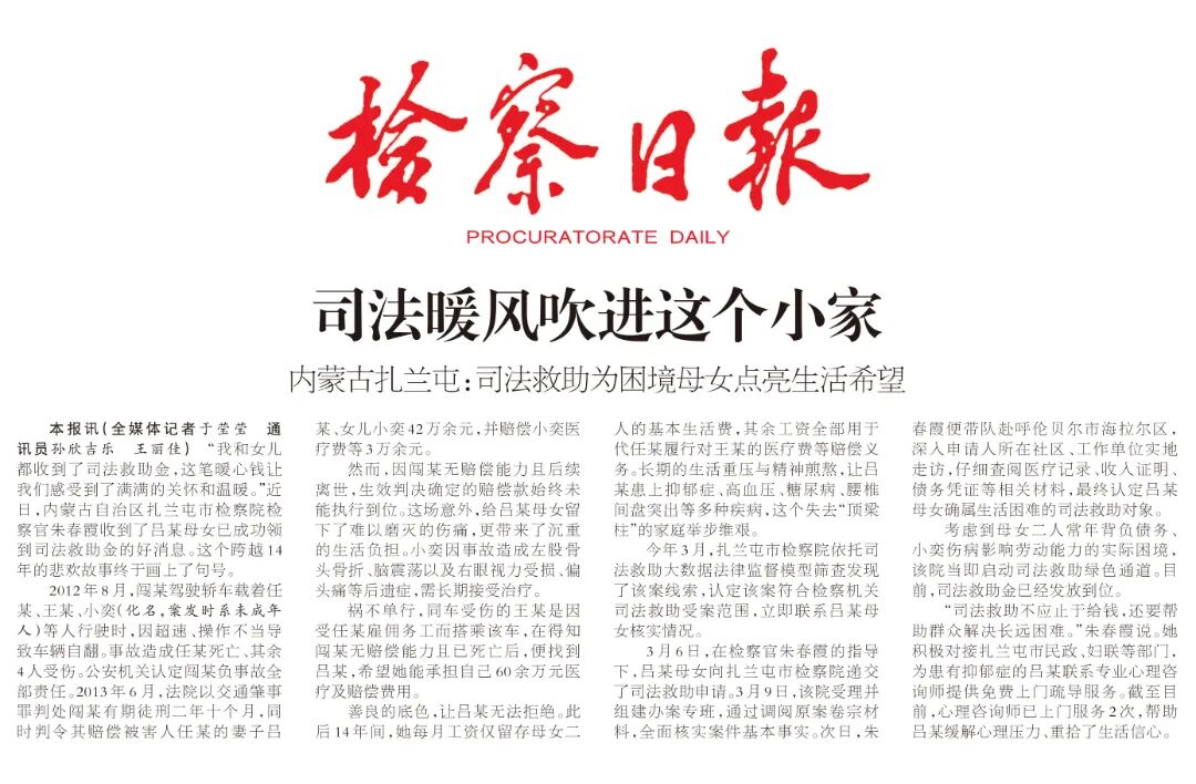 今年3月,扎兰屯市检察院依托司法救助大数据法律监督模型筛查发现了该案线索,认定该案符合检察机关司法救助受案范围,立即联系吕某母女核实情况。