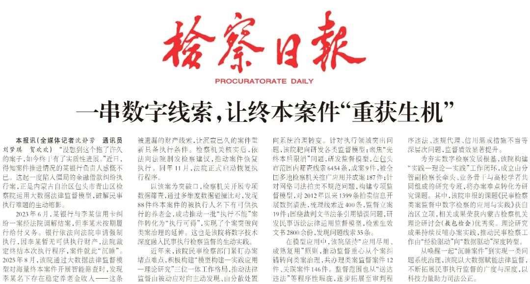 2023年6月,某银行与李某信用卡纠纷一案经法院调解结案,但李某未按期履行给付义务。银行依法向法院申请强制执行,因李某暂无可供执行财产,法院裁定终结本次执行程序,案件就此“沉睡”。2025年8月,该院通过大数据法律监督模型对海量终本案件开展智能筛查时,发现李某名下存在稳定养老金收入——这条被遗漏的财产线索,让沉寂已久的案件重新具备执行条件。检察机关核实后,依法向法院制发检察建议,推动案件恢复执行。同年11月,法院正式启动恢复执行程序。