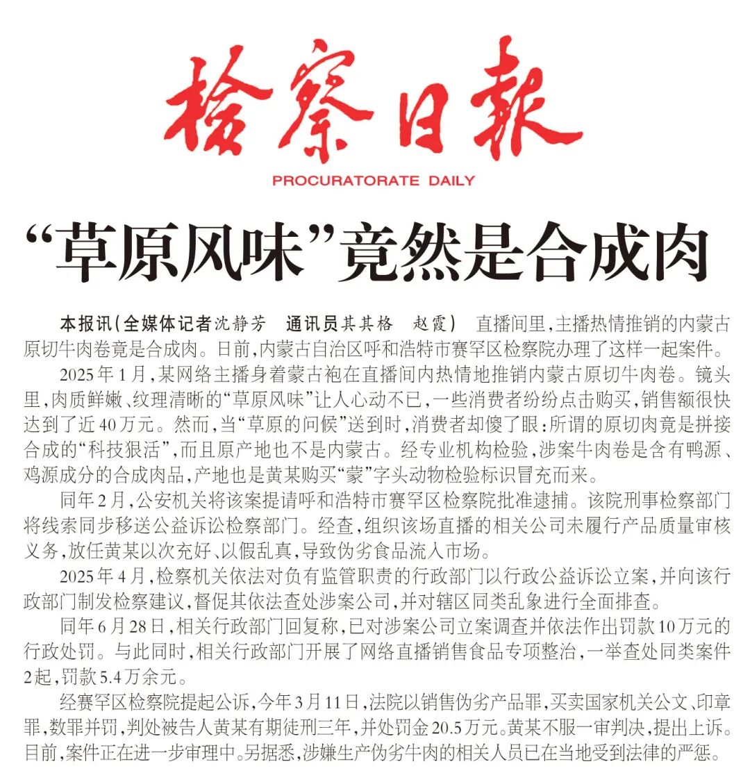 2025年1月,某网络主播身着蒙古袍在直播间内热情地推销内蒙古原切牛肉卷。镜头里,肉质鲜嫩、纹理清晰的“草原风味”让人心动不已,一些消费者纷纷点击购买,销售额很快达到了近40万元。然而,当“草原的问候”送到时,消费者却傻了眼:所谓的原切肉竟是拼接合成的“科技狠活”,而且原产地也不是内蒙古。经专业机构检验,涉案牛肉卷是含有鸭源、鸡源成分的合成肉品,产地也是黄某购买“蒙”字头动物检验标识冒充而来。
