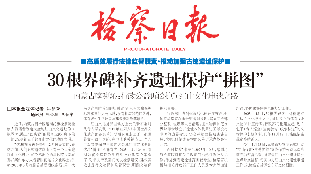 今年4月13日,赤峰市检察院正式启动“红山辽韵·申遗护航”文物保护公益诉讼检察专项监督活动,将聚焦红山文化遗址保护重点开展监督,切实助力红山文化遗址申遗工作,以检察公益诉讼守好文化根脉。