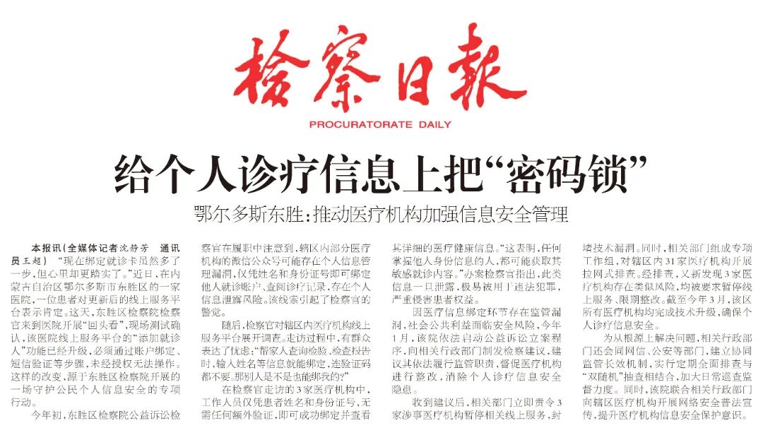 收到建议后,相关部门立即责令3家涉事医疗机构暂停相关线上服务,封堵技术漏洞。同时,相关部门组成专项工作组,对辖区内31家医疗机构开展拉网式排查。经排查,又新发现3家医疗机构存在类似风险,均被要求暂停线上服务、限期整改。截至今年3月,该区所有医疗机构均完成技术升级,确保个人诊疗信息安全。