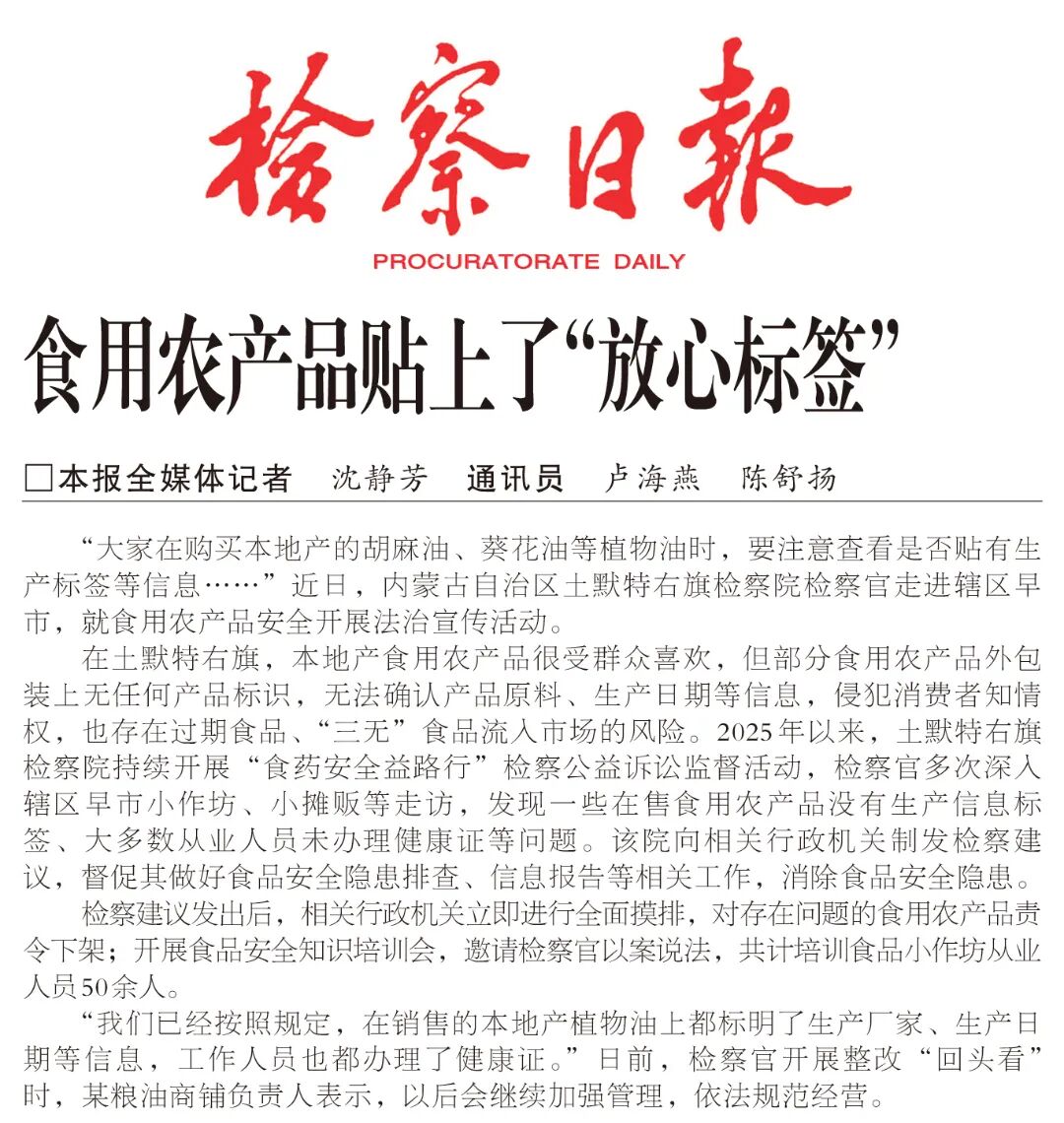 在土默特右旗,本地产食用农产品很受群众喜欢,但部分食用农产品外包装上无任何产品标识,无法确认产品原料、生产日期等信息,侵犯消费者知情权,也存在过期食品、“三无”食品流入市场的风险。2025年以来,土默特右旗检察院持续开展“食药安全益路行”检察公益诉讼监督活动,检察官多次深入辖区早市小作坊、小摊贩等走访,发现一些在售食用农产品没有生产信息标签、大多数从业人员未办理健康证等问题。该院向相关行政机关制发检察建议,督促其做好食品安全隐患排查、信息报告等相关工作,消除食品安全隐患。