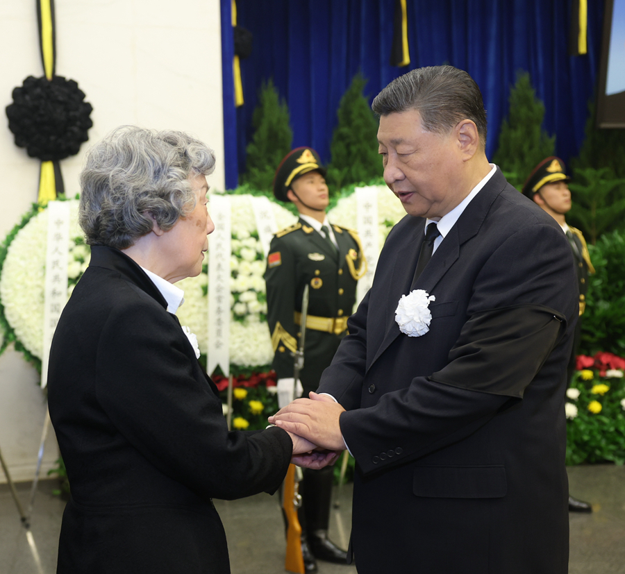 10月14日,吴邦国同志遗体在北京八宝山革命公墓火化。习近平、赵乐际、王沪宁、蔡奇、丁薛祥、李希、韩正等前往八宝山送别,胡锦涛送花圈表示哀悼。这是习近平与吴邦国亲属握手,表示深切慰问。新华社记者 鞠鹏 摄